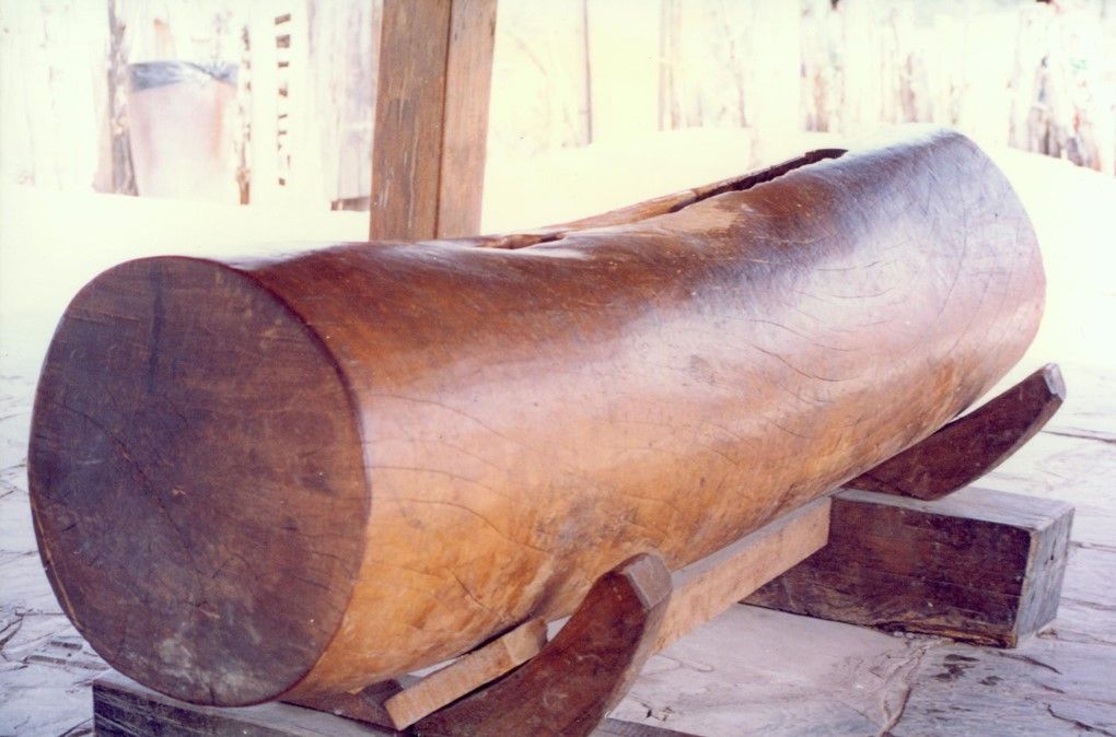 過去,佤族凡新建一個(gè)村寨,就要先找水源定寨址,再拉木鼓蓋木鼓房。佤族認(rèn)為木鼓是天神莫偉的床,木鼓房是莫偉的家,只有拉了木鼓,請(qǐng)莫偉天神進(jìn)寨保佑、才能建房立寨,拉木鼓的日子一般在佤歷一月,即公歷10月進(jìn)行。是時(shí),先由寨子派出有經(jīng)驗(yàn)的老人3—5人進(jìn)山選擇樹木,將選定的樹木每棵劈一點(diǎn)樹皮回來,由魔巴殺雞卜卦,哪棵的卦好就確定為做木鼓的樹,而后由魔巴率領(lǐng)青壯年男子進(jìn)山將樹砍倒,斷出一截做木鼓用。全寨男女老少盛裝艷服將木頭拉回,鑿成木鼓,安放于鼓房內(nèi)。拉木鼓的場(chǎng)面極為熱鬧壯觀,人們以能摸一下拉木鼓的繩索為最大的榮耀。木頭拉到寨外要舉行隆重的剽牛祭神儀式才能將木頭拉進(jìn)寨內(nèi)。木鼓有公母之分,公木鼓用紅毛樹,母木鼓用麻公樹。鼓長1.5-2米,鼓身直徑70—100厘米,一般是扁形和方形。洞深40-50厘米,洞口寬4-5厘米,長1.2-1.4米。洞呈瓜瓢形。背端多有牛頭形浮雕。由于所用本質(zhì)不同,公木鼓發(fā)音高亢清亮,母木鼓沉渾悠揚(yáng),響聲遙遠(yuǎn)。過去,只有逢村寨大事或械斗或集會(huì)議事,或祭祀鬼神,或告急友鄰才能敲響木鼓,平時(shí)是不能隨便敲的。由于佤族歷史上有獵人頭祭祀木鼓的習(xí)俗,村寨部落間經(jīng)常發(fā)生血族復(fù)仇的械斗。隨著獵頭陋習(xí)的革除,木鼓已從原始祟拜的氛圍中擺脫出來,成了人們喜愛的敲擊樂器,佤族編創(chuàng)了自娛自樂的木鼓舞。