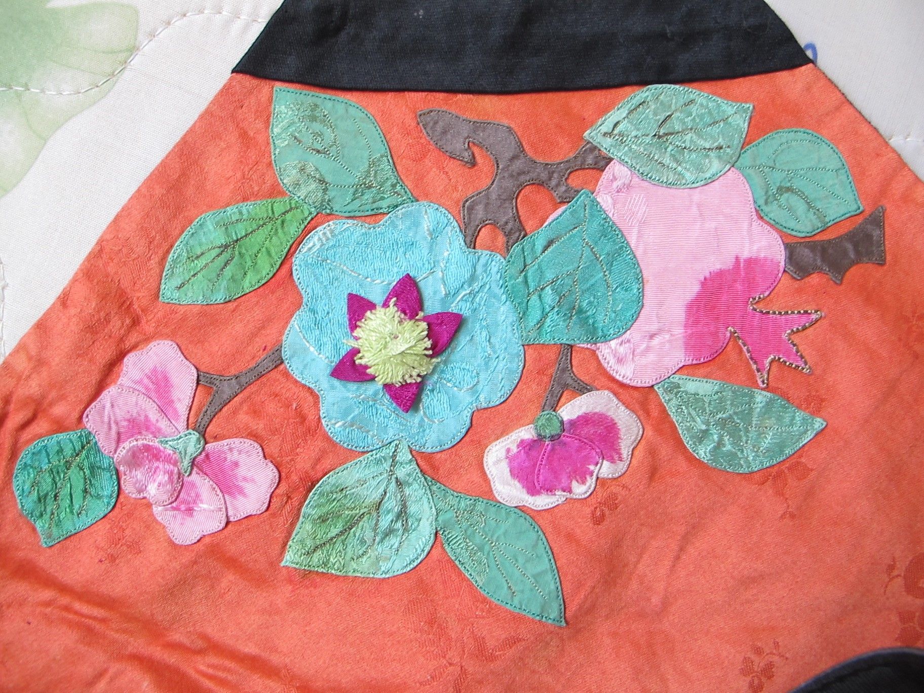 第四步是刺繡。機(jī)繡作品雖然操作簡便,速度快,工作效率高,但由于不能隨時(shí)調(diào)換粗細(xì)不同的機(jī)針或不同顏色的機(jī)線,圖案比較簡單,繡法也不能象手工繡那樣靈活多變,所以東鄉(xiāng)族婦女對(duì)能充分施展本領(lǐng)的手工繡情有獨(dú)鐘。