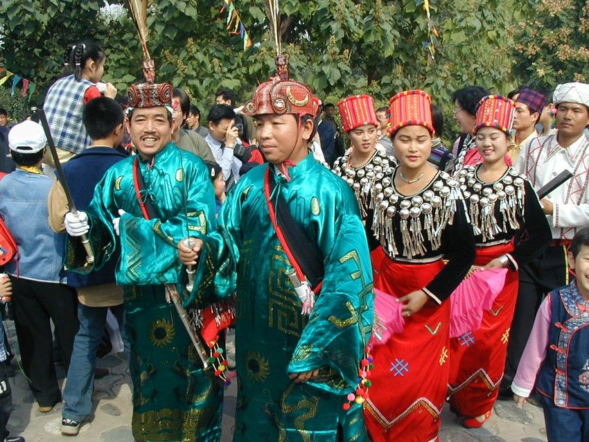 目瑙節(jié):又稱“總戈”,景頗語音譯,意思是“大伙跳舞”。目瑙節(jié)是景頗族最盛大的傳統(tǒng)節(jié)日,一般于每年農(nóng)歷正月十五以后的九天內(nèi)擇雙日舉行,節(jié)期三至五天不等。目瑙作為一種大型的群眾性歌舞活動(dòng),由來已久,歷史上,每逢豐年,出征、凱旋、婚姻嫁娶、敬祭鬼神等重要活動(dòng),均要跳“目瑙”。景頗族的“目瑙縱歌”原來是一種融宗教和文化習(xí)俗為一體的傳統(tǒng)慶典。隨著社會(huì)的發(fā)展,逐漸演化為各種不同類別的“目瑙”。大致有以下幾種:①“歲目瑙”,家庭財(cái)源茂盛,人丁興旺時(shí)舉行;②“布當(dāng)目瑙”,征戰(zhàn)取得勝利時(shí)舉行;③“貢冉目瑙”,同胞兄弟分家自立門戶時(shí)舉行;④“騰肯目瑙”,新建房屋住所落成時(shí)舉行;⑤“空然目瑙”貴族家娶親辦婚禮時(shí)舉行;⑥“達(dá)如目瑙”,出征時(shí)舉行;⑦“昔目瑙”,有名望的長者去世送葬時(shí)舉行;⑧“柱目瑙”,祭奠“木代”神時(shí)舉行。不同類別的“目瑙”都有特定的內(nèi)容和表現(xiàn)形式,但有一個(gè)共同點(diǎn)就是整個(gè)過程都是由“瑙雙”(領(lǐng)舞)隊(duì)和“瑙巴”(表演)隊(duì)組成的舞隊(duì)來表現(xiàn)和完成的。每逢目瑙節(jié)日,村村寨寨的景頗人身著節(jié)日盛裝,紛紛從四面八方涌入目瑙廣場。廣場上人山人海,氣氛熱烈歡快而不失莊嚴(yán)古樸的特色。廣場中央高豎著四根長約4米的目瑙柱,亦稱雌雄柱,中間兩根為陰,外面兩根為陽,上面皆繪有精美而富有象征意義的圖案:右邊柱上往往繪以蕨菜花紋,象征團(tuán)結(jié)奮進(jìn);左邊常畫回紋構(gòu)成若干個(gè)四方形,并涂以不同顏色,表示景頗族的遷徙路線;中間兩根柱子之間,交叉著兩把長刀,為景頗民族驍勇強(qiáng)悍、堅(jiān)強(qiáng)剛毅性格的具體標(biāo)志。目瑙柱的左側(cè)立著一個(gè)方形架子,上層是吹嗩吶的座位;前面掛著一個(gè)兩米長的大皮鼓和一面直徑一米多的大芒鑼,供跳舞時(shí)伴奏用。廣場四周用竹籬笆圍起,目的是為了防止野鬼的侵入和牲畜的干擾。舞蹈開始時(shí),鼓樂齊鳴,由兩位德高望重且又熟悉目瑙舞路線的老人身穿大龍袍,頭戴飾有孔雀、野雞羽毛和野豬牙齒的目腦帽,手持長刀領(lǐng)頭,后面跟著背銅炮和持長刀的隊(duì)伍,婦女們拿著扇子或彩帕跟在最后,邊歌邊舞,熱鬧非凡。參舞者少則百多人,多則幾千人,從清晨到日暮,以日暮到清晨,通宵達(dá)旦,其間舞者跳累時(shí)可自動(dòng)退場小歇片刻,然后繼續(xù)登場舞蹈?!澳胯Эv歌”作為一個(gè)民族的傳統(tǒng)活動(dòng)發(fā)展至今,宗教色彩和類別已日益淡化,它已成為景頗族約定俗成的傳統(tǒng)節(jié)日,統(tǒng)稱為“統(tǒng)肯(傳統(tǒng))目瑙”并賦予了新的內(nèi)涵,其內(nèi)容和形式都是展示一個(gè)民族的傳統(tǒng)文化,反映今天的新生活和對(duì)未來的美好向往。
