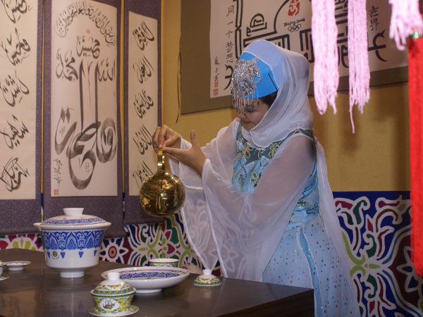 回族普遍喜歡飲茶。回族先民喜食甜品,在中國(guó)茶文化影響下,形成了以甜味為特色的飲茶習(xí)慣。飲茶之風(fēng)興起于中國(guó)晉代,盛于唐代以后,隨之出現(xiàn)了茶具,其中以包括茶托、茶碗、碗蓋的“三坯胎”蓋碗美觀實(shí)用?;刈謇^承發(fā)展了這種茶文化,形成了以“三炮臺(tái)”為茶具的“八寶蓋碗茶”:在茶具中放入茶葉(茉莉花茶、陜青茶、紅磚茶、窩窩茶、毛尖等)、糖(白糖、紅糖、冰糖、梨膏糖等)及紅棗、核桃仁、桂圓肉、芝麻、葡萄干、枸杞(或柿餅、山楂、姜片、果干)等配料,用開(kāi)水沖制后飲用。茶葉及配料在不同的地區(qū)、不同的季節(jié),根據(jù)飲茶者的身體狀況與喜好有不同的搭配,如“紅糖磚茶”“冰糖陜青茶”“三香茶”(茶葉、糖、桂圓)、“白四品”(陜青茶、白糖、柿餅、紅棗)、“紅四品”(磚茶、紅糖、紅棗、果干)、“五味茶”(綠茶、山楂、芝麻、姜片)等。八寶茶具有生津解渴、開(kāi)胃健脾的作用,放入不同的茶料,又具備了不同的健身康體功能。