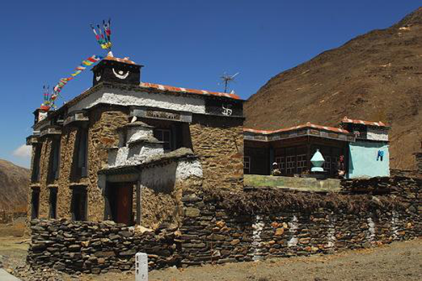 碉房是藏族很具代表性的民居之一,多為石木結(jié)構(gòu),外形端莊穩(wěn)固,風(fēng)格古樸粗獷。碉房一般有三到四層。底層養(yǎng)牲口和堆放飼料、雜物;二層布置臥室、廚房等;三層設(shè)有經(jīng)堂。由于藏族信仰藏傳佛教,誦經(jīng)拜佛的經(jīng)堂占有重要位置,神位上方不能住人或堆放雜物,所以都設(shè)在房屋的頂層。為了擴(kuò)大室內(nèi)空間,二層常挑出墻外,輕巧的挑樓與厚重的石砌墻體形成鮮明的對比,建筑外形因此富于變化。