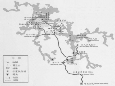 此外,值得一提的新景觀工程還包括對(duì)神山的改造與裝飾。位于祭祀廣場(chǎng)的北頭的山,是村落附近乃至普者黑地區(qū)最高的一座山,半山有一個(gè)天然溶洞就是著名的仙人洞。洞里主要由一個(gè)高20余米面積近100百平方米大穹廬和深淺不一的小洞穴組成,四壁是石鐘乳。進(jìn)入洞內(nèi),看見平時(shí)人們祭祀時(shí)遺留的陶瓷油燈、香爐、香燭、紅布、各色紙?jiān)`物等。據(jù)村民說,這洞是附近村落居民經(jīng)常前來祭祀求子的地方。筆者在洞口不遠(yuǎn)處看到用紅漆在石壁上書寫的署名為仙人洞村民委員會(huì)的“安民告示”,[ 安民告示內(nèi)容是:“仙人硐石林美景,不準(zhǔn)任何人破壞,違者罰款拾元”,落款時(shí)間為1987年。]據(jù)村委會(huì)黃先生介紹,目的是為了使該洞的石鐘乳得到保護(hù)并保持該洞作為村民信仰場(chǎng)所的純粹性。然而,2006年春節(jié),筆者在仙人洞洞口左右兩側(cè)所看到的是用青黑色顏料繪制有據(jù)說是守護(hù)神的一男一女以及類似飛天的新巖畫,為筆者向?qū)У碾S行村民說,是文化生態(tài)村項(xiàng)目組專家畫的。這樣的“創(chuàng)新景觀”巖畫,筆者后來在該村密枝山上還看到幾處,均出自項(xiàng)目專家的“生產(chǎn)”。原本視為神圣之地,禁止人畜進(jìn)入和隨意攀爬的密枝山,自成為生態(tài)文化村后,為旅游發(fā)展需要,已經(jīng)修建了經(jīng)由歌舞坪通往山頂?shù)氖?jí)道路,登上山頂能將普者黑景區(qū)和仙人洞村一覽無余。