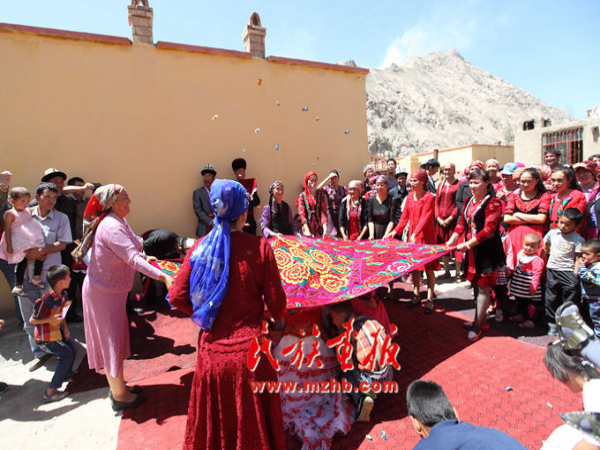 不一會兒,外面熱鬧聲一片。原來是迎親隊伍來了!只見新郎用一塊紅布遮住了臉,在眾人的簇擁下,緩慢前行。新郎的左右站了三位伴郎,他們一邊走,一邊唱起柯爾克孜族最具代表性的民間口頭文學“約隆歌”。每走幾步,新郎都會伴著歌聲的旋律和手勢鞠一下躬。新郎和伴郎腰間各系有一塊紅布,他們邊走,后面幾個新娘家的姐妹就要不時抓住他們腰間的紅布,往后拉一下,盡量不讓他們走得太快。其原因是希望他們多唱歌、多鞠躬,以表達對女方的尊重。