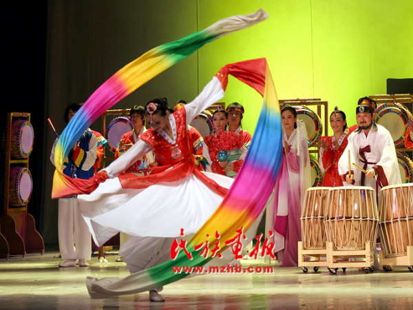 朝鮮族舞蹈種類繁多,各具特色。除了傳統(tǒng)的農(nóng)樂舞、象帽舞、長(zhǎng)鼓舞和頂水舞之外,還有雄壯的刀舞、典雅的扇子舞、神秘的假面舞等等,它們或舒緩,或剛毅,或柔美,或稚拙,輕歌曼舞間,你仿佛觸摸到了一個(gè)古老民族的靈魂,它是那么深沉內(nèi)斂,又是那么熱情奔放!