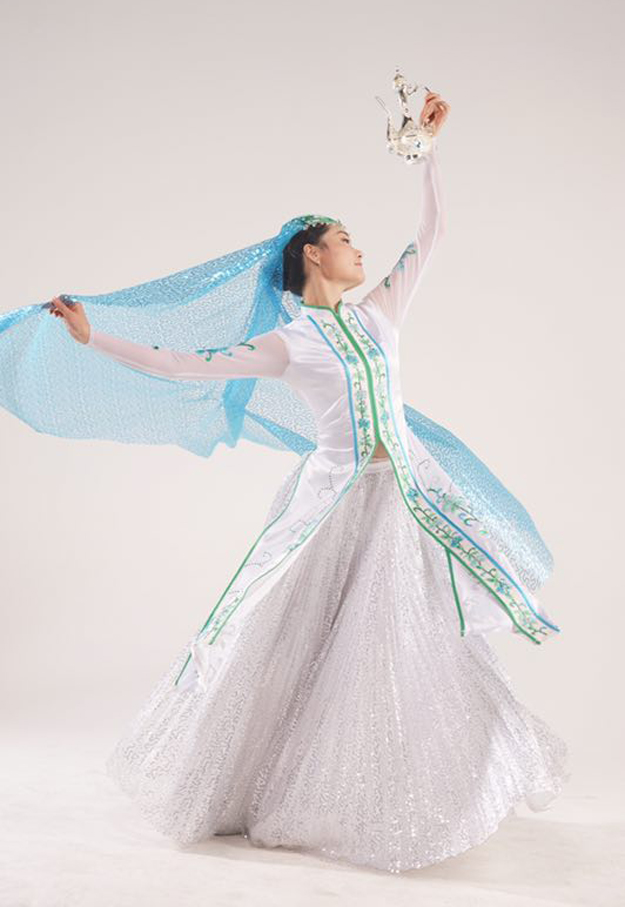 “湯瓶舞”流傳于寧夏回族自治區(qū)。舞者持白毛巾為道具,表現(xiàn)伊斯蘭教禮拜前用“湯瓶”(壺)盛水凈身之習俗。舞蹈中還常出現(xiàn)模擬“湯瓶”的形象,故有此名。舞蹈有“擦身”“搓背”以及揮舞毛巾互相抽打、嘻戲等動作(圖為手持湯瓶道具,表演回族舞蹈, 舞者娟子本人提供)。