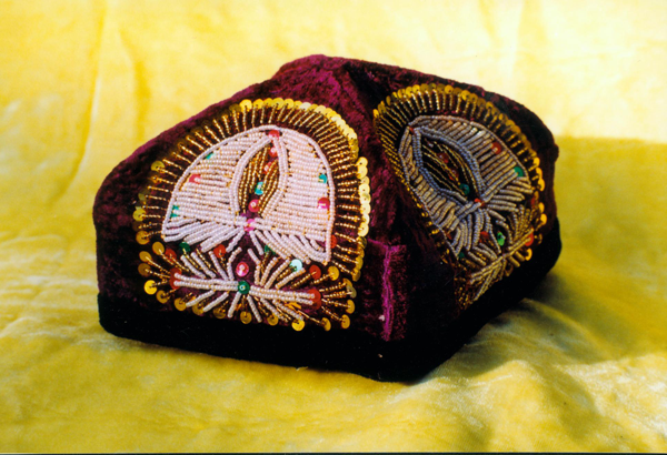 此外,維吾爾族花帽更是具有濃重的維吾爾特色,男女均可佩戴。古代人們佩戴花帽主要用于抵御風(fēng)寒,現(xiàn)代維吾爾人佩戴各類花帽則主要起到裝飾作用。維吾爾花帽造型多樣,其圖案花紋也各有不同,主要有以下幾類:巴旦姆花帽、塔什干花帽、格來木花帽、曼波爾花帽、奇曼花帽、再爾花帽、瑪日江朵帕、金片花帽、吐魯番花帽、伊犁花帽、夏帕克帽、賽里甫西吐瑪克。