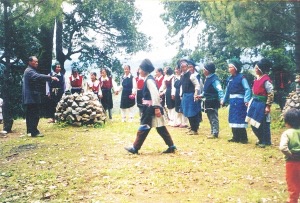 頌藥仙活動各村為陣,是一項以傳授藥物知識和防病方法為主題的歌舞活動。早早吃過晚飯后,人們集中到白天洗揀藥物的水邊,用青松和花草編扎的轎子抬上藥仙的肖像,敲鑼打鼓、載歌載舞,把藥仙抬到她的化身“定居”的山林中,舉行頌贊藥仙功績的儀式?;顒訄龅厮闹?,插遍各種花枝,花枝上掛滿姑娘們精繡的荷包,荷包中裝的是各種治病的藥粉。場中央燃燒著熊熊篝火,火邊供著藥仙的肖像。參加活動的人,各持兩束用藥用植物編成的“花束”,在歌頭的帶領(lǐng)下,眾人手舞“花束”,環(huán)篝火踏歌而舞。用動聽的歌聲,歌唱藥仙嘗百草、治疾病的故事;介紹用中草藥防病、治病的知識……踏歌接近尾聲時,人們便把手中舞耍的“花束”丟進篝火中焚燒,象征把各自身上的病疾丟盡,實際上是借焚藥草來達到消毒防病的目的。