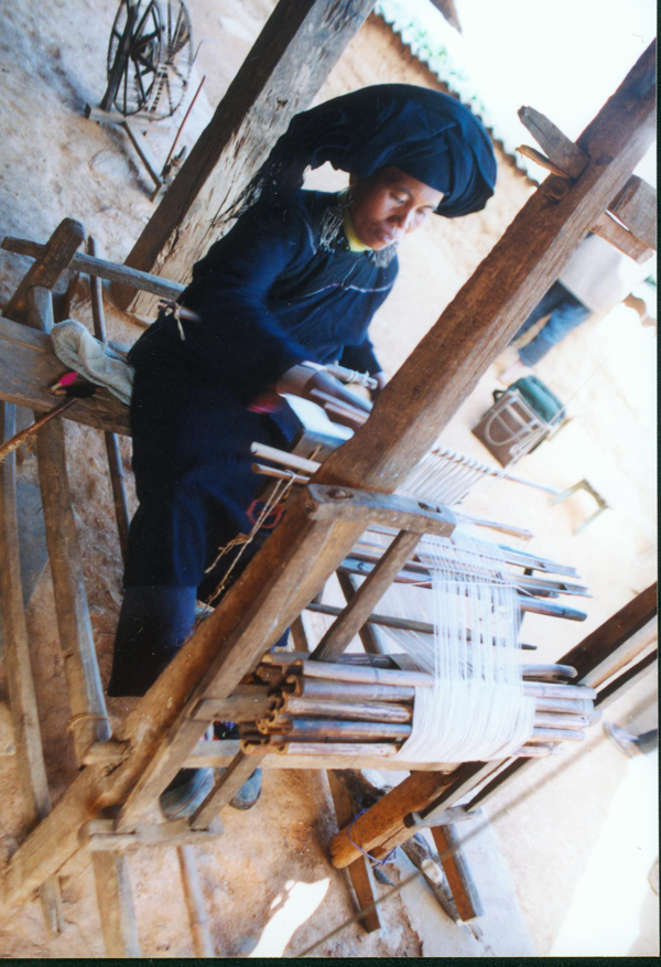 ?。?)染色。布朗族的印染技術(shù)比較單一,所使用的染色原料是自家栽種的藍(lán)靛和各種野生植物。根據(jù)所需顏色采用不同的植物,如染藍(lán)色取自藍(lán)靛,染黃色取自黃花汁。制作靛墨的程序是用水把藍(lán)靛的葉、莖泡化,撈去渣滓待其沉淀。染布時(shí),再配上一種樹(shù)皮,一起置于鐵鍋熬成藍(lán)汁,然后將白線或白布放入鍋中,反復(fù)熬煮幾次即成藍(lán)線或藍(lán)布。
