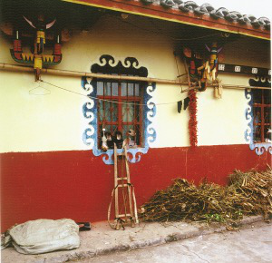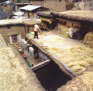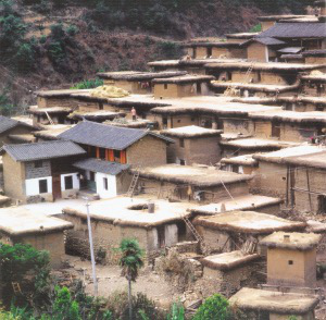 土掌房屋頂 云南楚雄地區(qū)的土掌房,是土墻、土頂、外墻和底層無(wú)窗的兩層樓房。有的內(nèi)院也蓋屋頂,稱“無(wú)內(nèi)院式”。設(shè)天窗采光,屋頂還能當(dāng)曬臺(tái)。整個(gè)村落沿山坡而建,巷道很窄,遠(yuǎn)遠(yuǎn)望去,你家的屋頂是他家的院壩,只要上了一家屋頂,就能靠活動(dòng)的木梯自由往來(lái)。