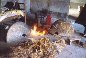 涼山彝族獨(dú)特的“鍋莊石” 。彝族的火塘為全家的生活中心,進(jìn)食、取暖、照明、會(huì)客、議事等都圍著火塘進(jìn)行。“鍋莊”由3塊石頭支撐,一般在房屋建成前就請(qǐng)石匠打造好鍋莊石。其石料選取沒(méi)有污垢而又無(wú)缺陷的青石,鑿成厚10厘米左右的變異扇形,上面刻有龍、火、日、月、魚(yú)、鳳等古樸傳神的浮雕圖案。日常生活中,一般在鍋莊“上方”(火塘里側(cè)至墻壁)設(shè)矮床。