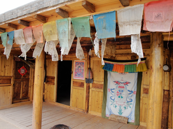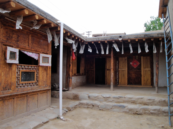 為改善狹小的寨內(nèi)空間,當?shù)鼐用窬藿硕幽窘Y(jié)構(gòu)樓房,和青海鄉(xiāng)村民居庭院寬敞的特點形成了反差。寨內(nèi)民居庭院多為四合院式,房屋為土木結(jié)構(gòu)平頂房,一般民居都有飛椽花藻之類。屋內(nèi)一般以木板作隔扇,室內(nèi)有護炕木板、護墻木板墻圍,且多雕花草于其上。房屋一般面闊三間,正面以木板隔墻并裝上木板條方格小花窗。佛堂設(shè)在二樓,佛堂所在的房屋一般都是上房,和佛堂不同向的兩邊廂房一般做臥室。院落中央一般都有豎掛經(jīng)幡的旗桿,還設(shè)有桑臺,具有明顯的藏式特點。