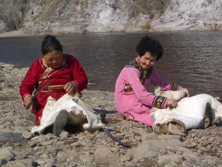 鄂倫春人過去在家庭公社“烏力鄰”里,同生產(chǎn)共消費(fèi),在當(dāng)時(shí)生產(chǎn)力十分低下的情況下,憑著扎槍和弓箭,單個(gè)人很難獲得能夠滿足衣食需要的獵物,必須要有“烏力鄰”全體成員的通力合作,才能戰(zhàn)勝兇猛和龐大的野獸,所以,在“塔坦達(dá)”領(lǐng)導(dǎo)下的集體狩獵是當(dāng)時(shí)最主要的勞動(dòng)形式。隨著生產(chǎn)力的不斷發(fā)展和個(gè)體小家庭的大量流動(dòng),不僅社會(huì)組織“烏力鄰”由原來血緣性的家庭公社演變?yōu)榈鼐壭缘牡赜蚬?,勞?dòng)組織也隨之發(fā)生了極大的變化。集體狩獵已不再是“烏力鄰”傾巢出動(dòng),而是由幾個(gè)小家庭的成員自愿結(jié)合成“安嘎”來進(jìn)行。同時(shí)還出現(xiàn)了集體和個(gè)人等多種勞動(dòng)形式。狩獵也不再單純是為了滿足衣食的需要,剩余獵物可以拿去交換,獵產(chǎn)品已趨于商品化。故此時(shí)一些珍貴的細(xì)毛皮張和藥用價(jià)值較高的獸類,成了鄂倫春人主要的狩獵目標(biāo)。這樣就形成了一年中的四個(gè)狩獵旺季,即:農(nóng)歷正月至2月是“鹿胎期”;4月至6月是“鹿茸期”;9月至落雪為“叫鹿尾期”;落雪后至來年開春是“打皮子期”。大概是源于原始的圍獵,鄂倫春人把狩獵叫“打圍”,而這四個(gè)狩獵旺季就叫“紅圍期”。“紅圍期”除“叫鹿尾期”外,都組織“安嘎”集體出獵。“安嘎”是一種臨時(shí)性的狩獵組織,狩獵旺季將臨時(shí),由一人發(fā)起,串聯(lián)幾位親朋好友或志趣相投的人組成一個(gè)“安嘎”,待獵期結(jié)束,“安嘎”自行解散,下次出獵時(shí)再重新組合,因此其成員并不是固定的(圖為熟化狍皮,吳雅芝攝影)。