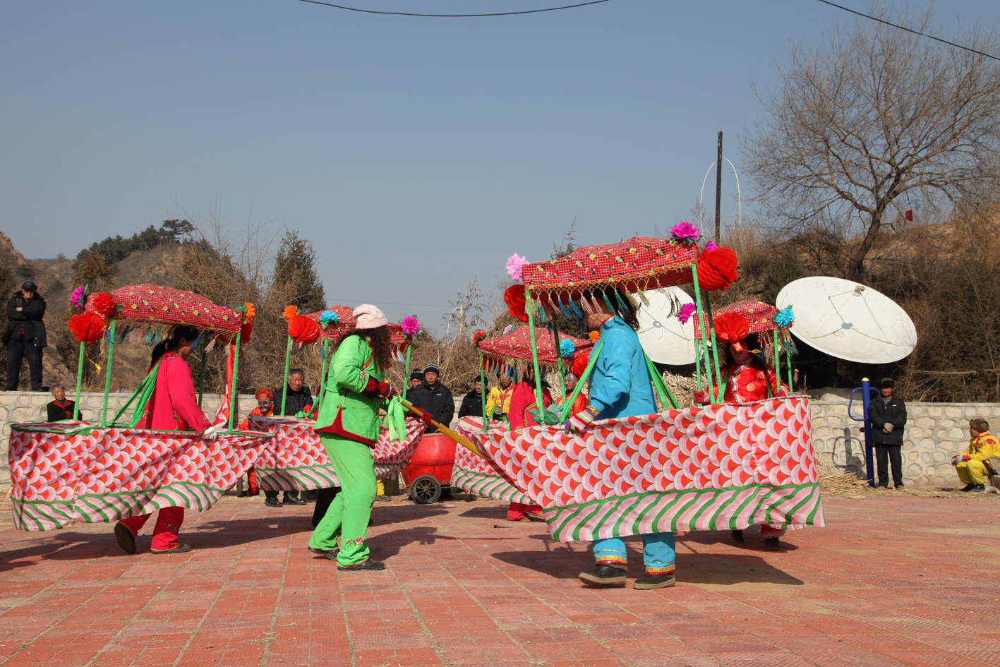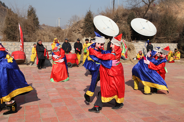 “二貴摔跤”,表演者實(shí)為一人,穿戴巧妙制成的道具,就可以扮演兩個扎小辮的頑皮兒童扭打摔跤。單人扮雙人摔跤,模仿得維妙維肖,一時難辨真假,風(fēng)趣幽默。