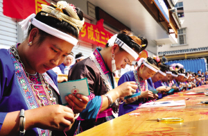 三江縣同樂苗族鄉(xiāng)舉辦刺繡手工限時賽,繡娘們向游客們展示傳統(tǒng)的少數民族刺繡技藝