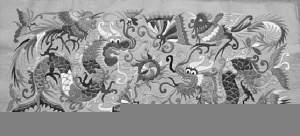 曾憲陽(yáng)的收藏中,有一件貴州月亮山蠟染“百鳥(niǎo)衣”,極為罕見(jiàn)。“漢文古籍中描述的人面蛇(龍)身的女?huà)z,牛(人)首蛇身的伏羲,以及兩頭蛇、多頭蛇、雙身蛇的形象,在這一件服飾中都可以看到?!痹愓f(shuō),云雷紋、回紋等商周青銅紋飾在許多苗族服裝中的兩袖及前后擺都要使用;人物的衣裙、動(dòng)物的身軀也大量使用青銅紋填充……