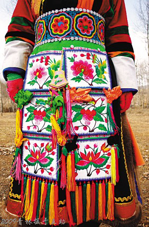 隨著時(shí)代的更替,土族女性的服飾發(fā)生了很大變化,有的傳統(tǒng)服飾已消失,有的服飾經(jīng)過推陳出新,重放光彩。如舊時(shí)的繡花高領(lǐng),如今變成直翻兩用領(lǐng);蓋在“扭達(dá)”上的長頭巾——“扭達(dá)爾秀巾”,變成了今日土族女性使用的短頭巾?,F(xiàn)今,廣大土族女性,不僅喜穿本民族服飾,而且還愛著時(shí)尚服飾,她們或使土族服飾時(shí)裝化,或使時(shí)裝土族服飾化,豐富了土族的服飾文化。