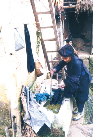 紡紗、織布、藍(lán)染,是哈尼族婦女制作服裝的重要組成部分。她們?cè)诳棽记耙龅臏?zhǔn)備工作,就是操動(dòng)制線機(jī),把一根根短小的線連接起來(lái),捲在小木棍上,然后操動(dòng)絞線機(jī),把線棍上的線分開(kāi)絞在木梭子和木輪子上。接著是分線,人數(shù)不限,但不能少于5人,一般10米為一組線??棽紩r(shí),在織布機(jī)上方搭起兩排密集的線網(wǎng),當(dāng)雙腳踩動(dòng)踏板時(shí),兩排線網(wǎng)一上一下地交叉移動(dòng),將拖著線的梭子一次次地左右穿梭于線網(wǎng)中。這樣重復(fù)地進(jìn)行,就織出一筒筒布,一般10米為一筒布。最后把織成的布放入靛缸里泡洗,曬干后就可以制作服裝了。