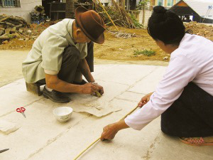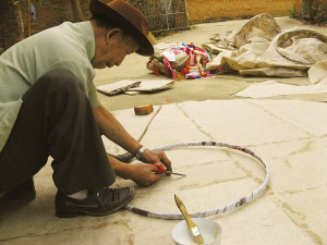 言談間,巖妞把制好的竹環(huán)放入早已畫好的同心圓圖案中的小圓上,只見竹環(huán)大小正好與小圓吻合。巖妞說,圖案外側的大圓便是擺放棉紙用的。接著,他把手中厚厚的幾張棉紙圍繞著已經放入圖案中的竹環(huán)依次擺入,直至擺滿。在同心圓圖案的上側,巖妞還畫了一個寬與同心圓圖案的直徑相符的矩形圖案,把棉紙鋪滿其中。巖妞說,這圖形就是“貢菲”的高度。制作的最后一道程序,是把棉紙用漿糊粘合起來。陰干后,一個“貢菲”就做好了。