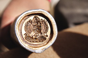 制作帕肯的材料五花八門,有泥土、經(jīng)書(shū)粉、藥材、香灰、花粉、玻璃纖維、高僧骨灰、圣物、貝殼粉、橡膠、金銀、管符(一種寫有經(jīng)咒的金屬細(xì)管)、珍貴帕肯磨成的粉末……選擇它們其中的一些混合在一起,就可以制作不同的帕肯了。近20年來(lái),大量金屬帕肯出現(xiàn),現(xiàn)在基本占到了帕肯總量的一半。大致會(huì)有金、銀、銅、五合金、九合金、礦石合金等6種金屬會(huì)被使用到帕肯制作中。金屬帕肯可以制作得更精細(xì)、保存時(shí)間更長(zhǎng)久。