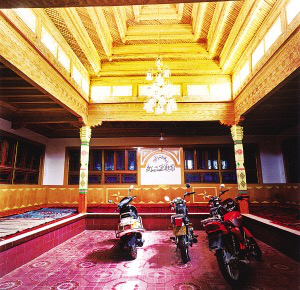 和田的“阿以旺”民居。和田地處塔克拉瑪干沙漠的南部,冬冷夏熱,干旱少雨風(fēng)又大,蒸發(fā)量是降雨量的幾十倍。為了適應(yīng)氣候,維吾爾人創(chuàng)造了平頂土房,房內(nèi)居室分冬室和夏室兩部分。在維語中,“夏室”又稱“阿以旺”,建筑前面的外廊,其地面高出院落地面近一米,形如土炕,鋪氈毯,是每年5 ~ 11月份日常生活、待客的主要場所,晚間鋪被褥即可睡覺。設(shè)天窗側(cè)向采光