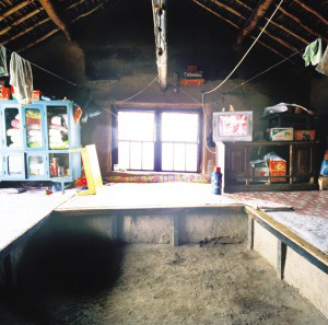 達斡爾族住房以兩間或三間居多,以西屋為上,不設北窗。東西兩屋的南面各有3扇窗戶,中間一間在房門兩側各有一扇窗戶,西屋開兩扇西窗,更利于采光和通風,這在北方民居中比較少見。兩間房的西屋是起居室,南、西、北三面連炕,成“凹”字形,與滿族的“萬字炕”差不多。近些年,達斡爾族家庭人口少了,特別是結婚的新房只搭北炕,南面放置組合家具和冰箱、洗衣機。東屋開南門,作為廚房,砌鍋灶,一般用8印或10印的鐵鍋。煙囪在墻外,與房頂有距離,有的用草垡子壘砌,有的用木板,這樣的煙囪不僅抽力大,灶堂好燒,而且可以避免草房頂的火災。近十幾年建的房子,煙囪都在西山墻上用磚壘砌,一直伸出屋脊后坡,高出房頂一米多。