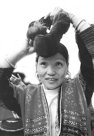 我們來到廣西龍勝各族自治縣和平鄉(xiāng)黃洛紅瑤寨時,還沒有進寨,就看見三三兩兩的婦女在河水清清的河邊洗頭。她們梳洗著清亮的發(fā)絲,1.6米左右的頭發(fā)又長又黑,飄飄灑灑。長發(fā)是紅瑤女的一大特色,紅瑤有世代相傳的蓄發(fā)、護發(fā)、梳妝發(fā)型的秘方。紅瑤女十二三歲開始蓄發(fā),長到一定的長度可以剪下珍藏。等到30歲左右,就可以和秀發(fā)一同盤起。
