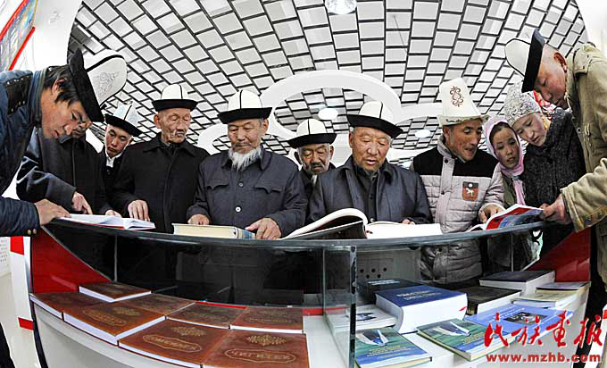 阿合奇縣哈拉布拉克鄉(xiāng)《瑪納斯》博物館里,人們?cè)诜営嘘P(guān)瑪納斯的作品