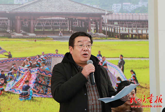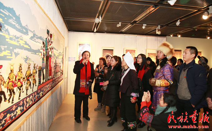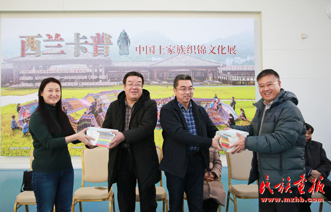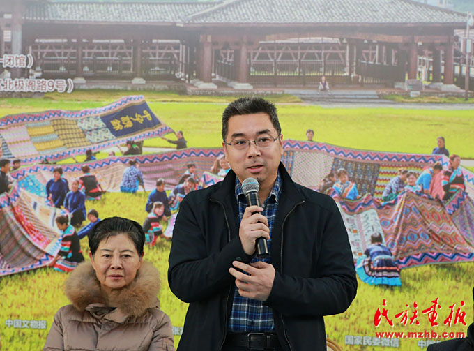 會上中國民族博物館黨委副書記、副館長張志文向少數(shù)民族作家們介紹了展覽,他說:“土家族是一個歷史悠久的民族,現(xiàn)在有835萬人口。土家織錦也有兩千多年的發(fā)展歷史,有250多種傳統(tǒng)圖案,是中國民間五大織錦之一,堪稱中國服飾文化中的奇葩。中國民族博物館從歷年征集收藏的300多幅清代以來的土家織錦中,選取了156幅精品土家織錦、21分鐘傳承人視頻和120余幅土家民族風(fēng)情照片。我們和中國婦女兒童博物館合作舉辦了這個高品質(zhì)的專題展,旨在傳承和弘揚(yáng)土家族國家級非物質(zhì)文化遺產(chǎn)。”