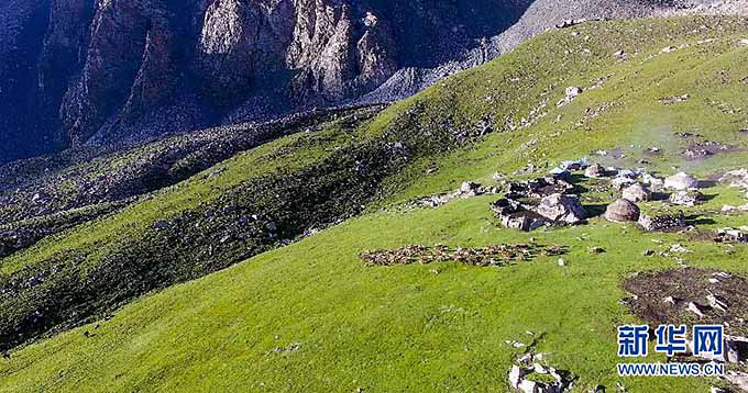 在“鐵日孜窩孜”夏牧場(chǎng),喀拉塔什其木干村的村民們清晨將羊群趕到牧場(chǎng)上吃草