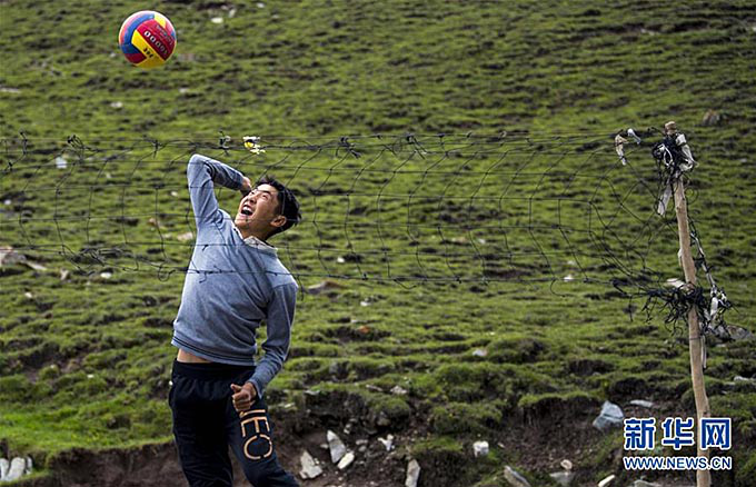 開學(xué)就該上高三的喀拉塔什其木干村村民圖潤(rùn)塔依·艾沙買買提用木棍和簡(jiǎn)易的網(wǎng)子在家門口的空地上劃了一塊排球場(chǎng)