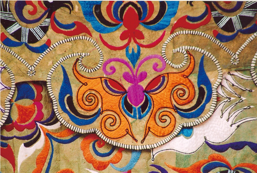 在苗族各種工藝的服飾圖案中,蝴蝶是俯拾皆是的,而丹寨縣雅灰鄉(xiāng)和榕江縣高排鄉(xiāng)等地的苗族百鳥衣上,大面積地使用絲帛和絲線刺繡,常在中心位置繡著一種奇特造型的動物圖案,頭是變形的鳥頭,身是蟲身,有節(jié),周圍是飛舞的蝴蝶。不少人解釋它為龍。其實(shí)那是蠶蟲、鳥、蝴蝶的結(jié)合:蝴蝶——鳥——蠶蟲——一幅圖本身就包含了蝴蝶圖騰的全部寓意。