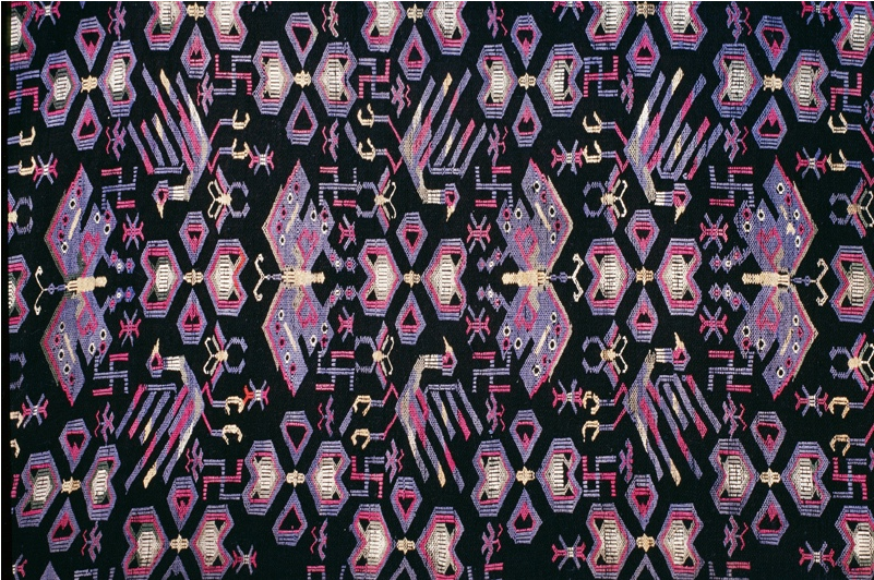 亳無疑問,蝴蝶圖騰即是對蠶的崇拜,蠶文化原初的核心便是人歸途的儀式,人要在這種和蠶一祥的儀式中得到再生。今天的苗族,仍然保持著以絲綢裹身而葬的喪葬習(xí)俗。我祖母養(yǎng)蠶織就的絲織品,我們習(xí)慣稱作蠶絲床單,絕大部分是備著喪葬所用。凡有人去世,主客必送一床蠶絲單,沒有是不行的,被視為不懂禮節(jié),而死者獲得蠶絲單越多越好。有的人家收到的蠶絲單過多,就會保存一部分,留著將來的喪事送禮。苗族每個人都必備一件絲質(zhì)壽衣。并且,在許多重大的儀式活動中必須要著絲綢服裝。比如在苗族重大的鼓藏節(jié)期間,鼓社頭必須穿絲織鼓社服;大祭典活動時,祭師也必須穿絲質(zhì)服裝等等。