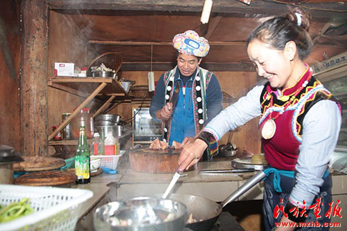 早上,老姆登村73歲的怒族老人斯普早早起來招呼兒子郁伍林、兒媳魯春花:“春節(jié)快放假了,客棧的生意會忙得不可開交,趁著現(xiàn)在客人不多,家里人先吃一頓團(tuán)圓飯吧?!彼蛊绽习樵缒赀^世,7個(gè)兒女中老五郁伍林在身邊照顧她?!斑^去在春節(jié)才能吃上一頓好飯菜,也要準(zhǔn)備很長時(shí)間,現(xiàn)在每天都有好吃的,天天在過年,多虧了黨的好政策?!闭f起今天的幸福生活,生在舊社會的斯普感慨萬千。