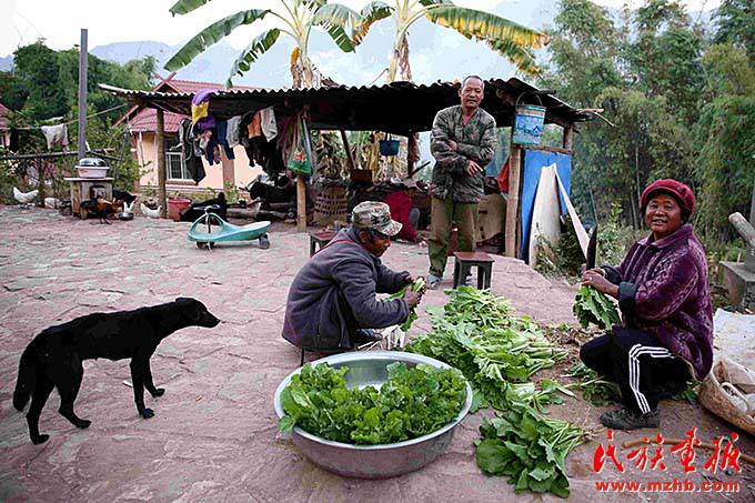 在娜作家記者見到了娜作的老伴兒大巖恩,他邊清理打捆著剛剛采摘下來的青菜邊說:“這些小菜城里人特別愛吃,沒有上化肥,一點污染沒有。這筐菜在城里一定能賣個好價錢。”