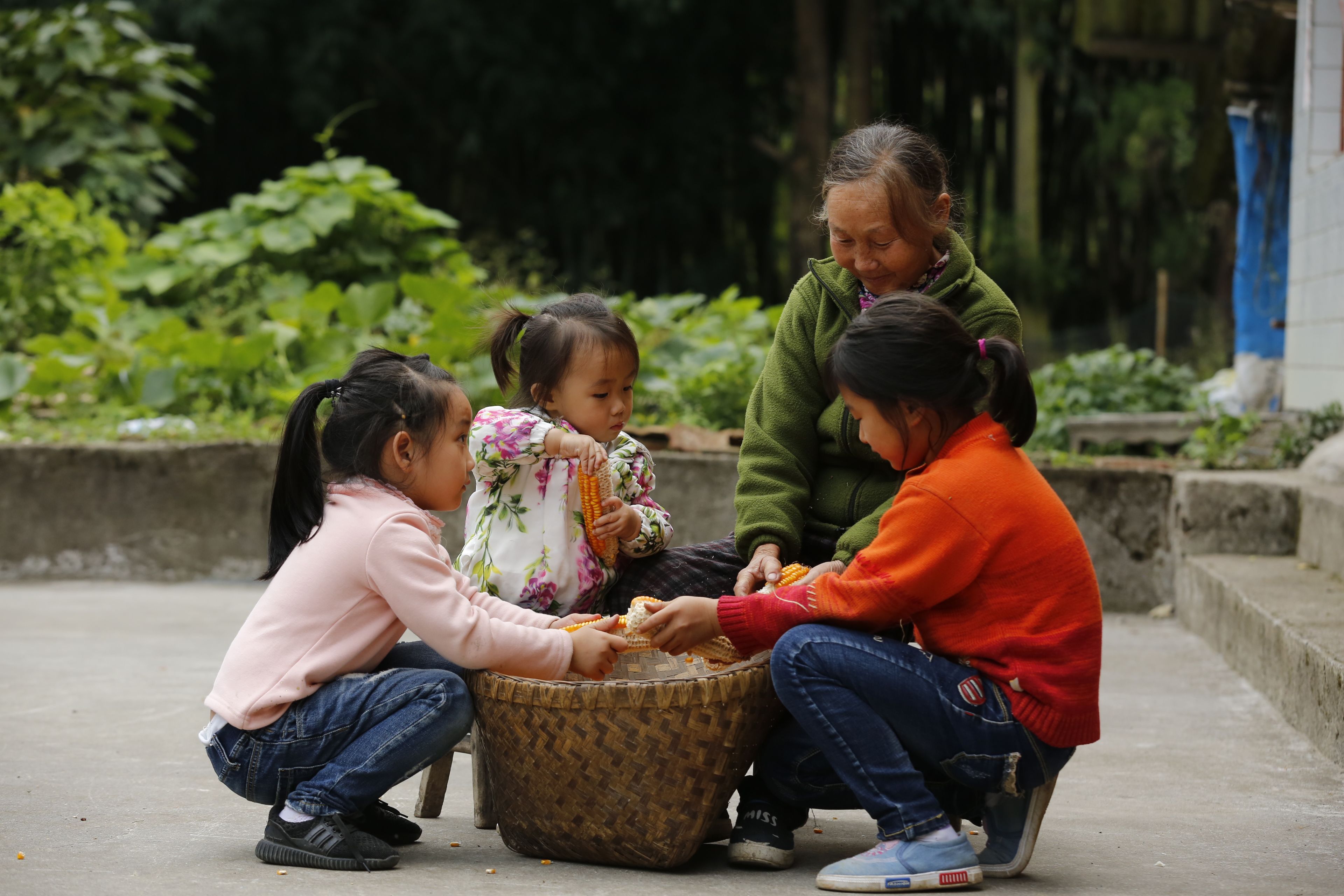 苗族老年人與兒童剝玉米2