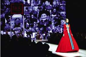 在活動(dòng)現(xiàn)場(chǎng),隨著一曲旋律優(yōu)美、委婉動(dòng)聽(tīng)的布依歌謠《穿上阿媽的繡花衣》,4位布依族繡娘唱著古老的歌謠走進(jìn)秀場(chǎng)。她們安靜地坐在舞臺(tái)上飛針走線(xiàn),以嫻熟的繡藝做起了日常的針線(xiàn)活。45套以中國(guó)刺繡元素為設(shè)計(jì)靈感的EVE CINA時(shí)裝、24套國(guó)金黃金股份有限公司專(zhuān)題設(shè)計(jì)的中國(guó)元素配飾逐一呈現(xiàn)在觀眾面前。秀場(chǎng)上演了一場(chǎng)東方時(shí)裝之美的視覺(jué)盛宴。