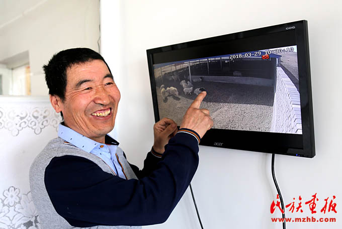 牧民朱寶忠利用監(jiān)控器可隨時了解棚舍里羊群的情況