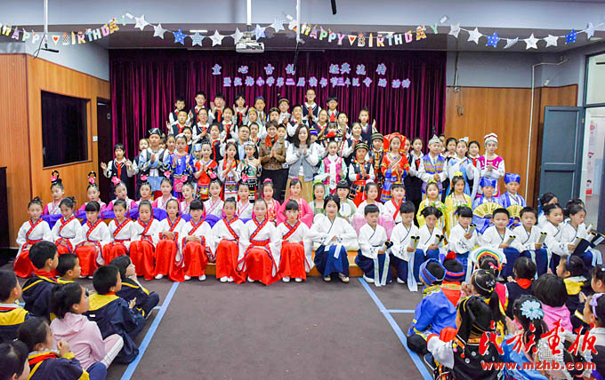 同一天下午,一場精彩的T臺秀在上海市閔行區(qū)梅隴鎮(zhèn)弘梅小學(xué)上演。小學(xué)生們身著民族服裝亮相,動感的音樂、精彩的表演,將“民族團(tuán)結(jié)一家親”的理念演繹得生動活潑。學(xué)校布置的民族文化墻上,展示了我國56個(gè)民族的風(fēng)土人情,營造了多姿多彩的民族文化氛圍,讓民族特色文化陪伴在學(xué)生身邊。
