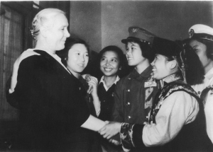 1955年9月蘇聯(lián)卓婭和舒拉的媽媽(左一)訪問中國時(shí)接見中國的“瓦爾瓦娜”(蘇聯(lián)電影《鄉(xiāng)村女教師》女主角)、全國青年社會主義建設(shè)積極分子阿角(右一),時(shí)有郝建秀(左三)、徐建春(左二)同志在場。 資料圖片