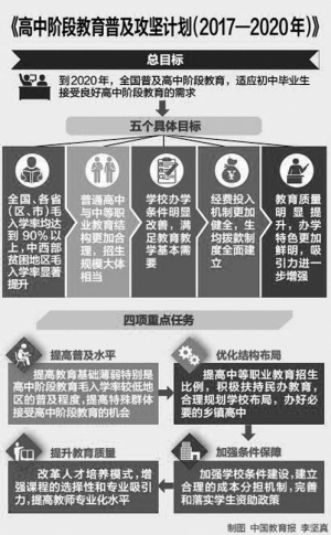 “高中教育是選擇性教育,僅僅提供學(xué)位,缺乏吸引力,學(xué)生不愿意上,普及目標(biāo)就難以實現(xiàn)?!苯逃肯嚓P(guān)負(fù)責(zé)人解釋說,在確保普及程度的基礎(chǔ)上,要體現(xiàn)全面科學(xué)的普及觀,防止簡單追求數(shù)量和規(guī)模的增加。因此,除了2020年我國高中階段教育毛入學(xué)率將要達到90%這個總目標(biāo)外,《攻堅計劃》還提出了5個具體目標(biāo):