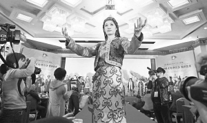 2012年12月,由全國(guó)《格薩(斯)爾》工作領(lǐng)導(dǎo)小組辦公室、青海省《格薩爾》工作領(lǐng)導(dǎo)小組辦公室等聯(lián)合主辦的中國(guó)·青海·果洛《格薩爾》藝人成果展暨圓光中的《格薩爾》史詩(shī)藝術(shù)展在北京舉行。圖為開幕式上模特在展示《格薩爾》史詩(shī)中所描述的民族傳統(tǒng)服裝。 資料圖片