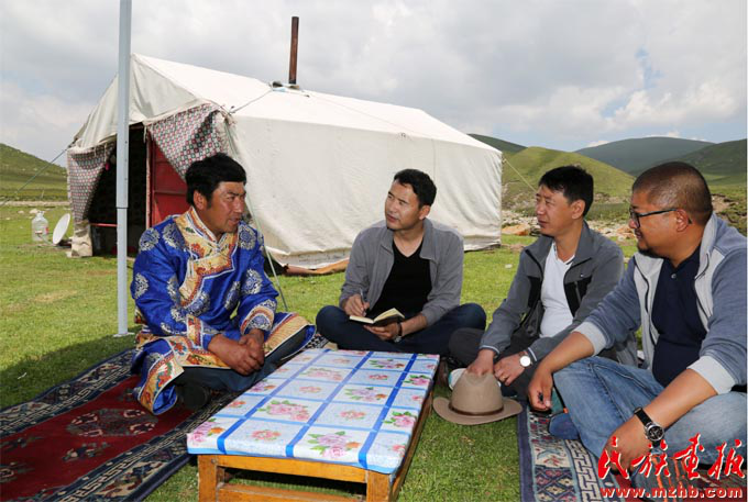 土旦(左)入戶向牧民宣傳草原法律法規(guī)和國(guó)家相關(guān)草原保護(hù)政策(黃若天 攝影)