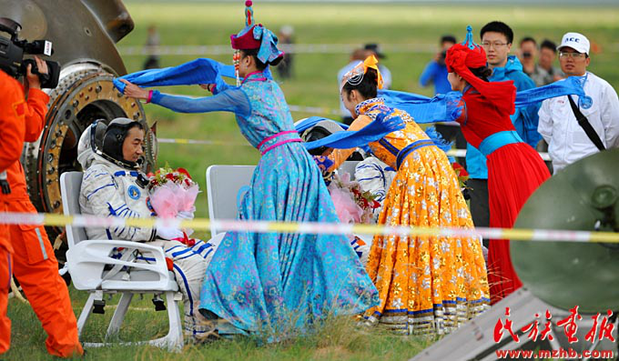 2013年6月26日,神舟十號(hào)返回艙平安返回,圓滿完成任務(wù)的三位航天員張曉光、聶海勝、王亞平自主出艙后接受蒙古族牧民的祝賀(吳運(yùn)生 攝影)