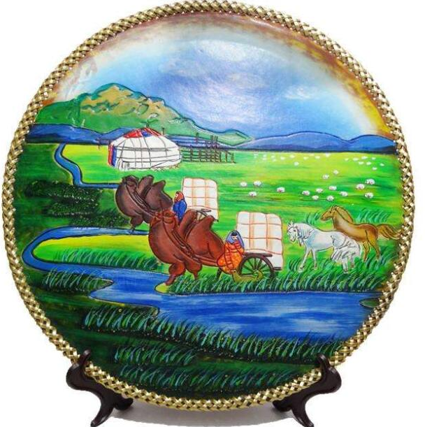 蒙古皮畫,精選草原天然優(yōu)質(zhì)牛皮經(jīng)過特殊描繪、著色、層染、拋掐光、定形,半浮雕凹凸壓制等一系列工藝、幾十道工序,純手工制做完成。充分利用和展示了天然皮革所具有的皮質(zhì)皮色,具有線條流暢,構(gòu)描圖別致,立體感強,色彩柔和等特點,給人以全新的藝術(shù)享受。