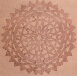 該剪紙出土于吐魯番市阿斯塔那303號墓,不僅保存完好,而且構圖對稱、畫面均勻、線條流暢、美觀大方,可以和現(xiàn)代民間剪紙藝術相媲美。剪紙為圓形,呈土黃色,中心圖案為八角花形,依次向外為兩圈菱形花紋,交叉錯落,排列有序;再向外圈為梯形紋組成的三角形邊飾。整個剪紙圖案層次分明,變化繁復,頗有韻律感。這幅剪紙為折疊后一次剪成,造型簡潔,刀法洗練,具有古樸濃郁的民間風格。