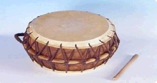 鼓框為木質(zhì),兩面蒙皮,用繩索固定在木框兩邊。鼓鏈木質(zhì),通常在表演中負責敲擊主要旋律的重拍,也有獨奏的情況,聲音有力。