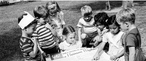 1950年,聯(lián)合國國際育童學(xué)校的孩子們在閱讀第一張《世界人權(quán)宣言》的海報(bào)。