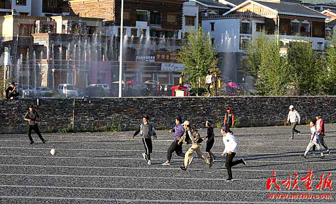 災(zāi)后重建讓玉樹大踏步前進,人們悠閑地走在廣場上享受著基礎(chǔ)設(shè)施改善帶來的各種便利