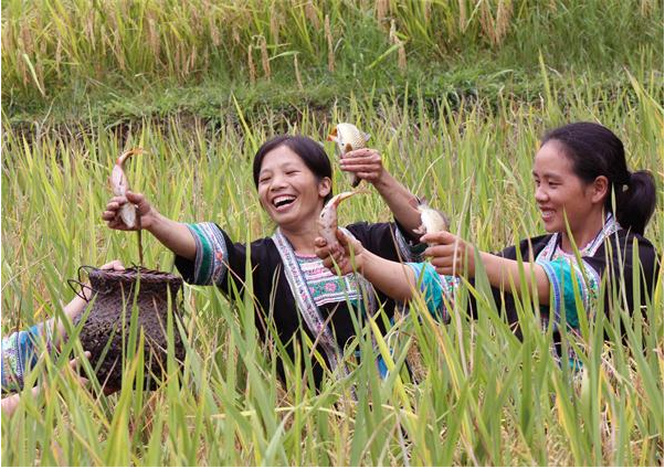 吃的時(shí)候,大家圍攏到火堆,一手拿著糯米飯,一手拿著燒鯉,撕開成片,邊蘸鹽水邊吃。男人舉杯對飲,到處是“呀-嗚-呀-嗚-”的喜慶豐收喊聲和悅耳動聽的苗歌聲,好一幅農(nóng)家樂圖畫。