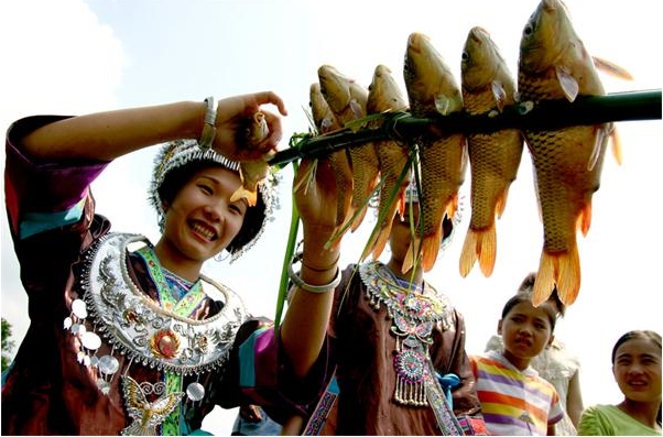 燒魚是廣西融水苗胞的習(xí)俗之一,融水的苗族同胞素有在稻田里養(yǎng)魚的習(xí)慣,每年春插,苗家人向來喜歡在稻田里放養(yǎng)鯉魚。每年的秋收稻黃時(shí)節(jié)也是田鯉肥壯之時(shí),這時(shí)來自四鄉(xiāng)八寨眾多的各民族兄弟便匯聚起來,點(diǎn)燃一堆堆篝火,燒田鯉吃野餐,盡享豐收喜悅。燒魚從9月稻黃收割開始持續(xù)到12月底才正式結(jié)束,故名“元寶山金秋燒魚季”。燒魚季節(jié),苗寨家家戶戶釀起醇濃的甜酒,蒸著香噴噴的糯米飯,帶上食鹽、辣椒、蒜苗、蔥花、薄荷等佐料上山去剪禾。晌午時(shí)候,他們在田頭或田邊的平地?zé)鹨欢讯洋艋?,從田里抓來一籠籠活蹦亂跳的鯉魚,用樹枝或竹片把魚一條條串起,排成一排,然后放在紅彤彤的火炭上翻來覆去地烤,大約半小時(shí)左右,魚被烤炙得“呲呲”作響,水分烤干,慢慢地變黃,直至熟透,香飄四溢,遠(yuǎn)遠(yuǎn)就可聞到香味。